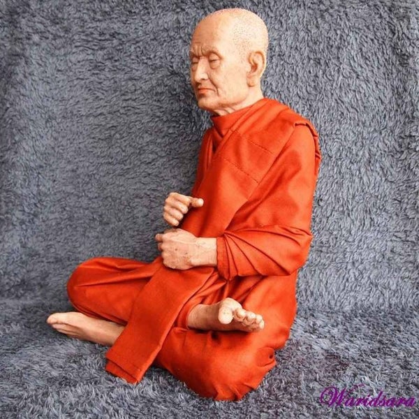 Geheel met de hand vervaardigde Thais Boeddhistische monnik. De monnik is geheel in de originele stijl vervaardigd naar beeltenis van de inmiddels overleden monnik. De kleding is in originele kleurstelling en dracht zoals deze in het klooster van deze monnik werd en nog steeds wordt gedragen.