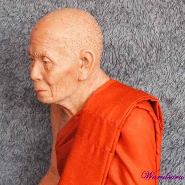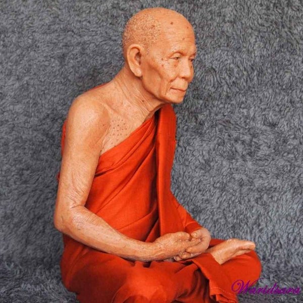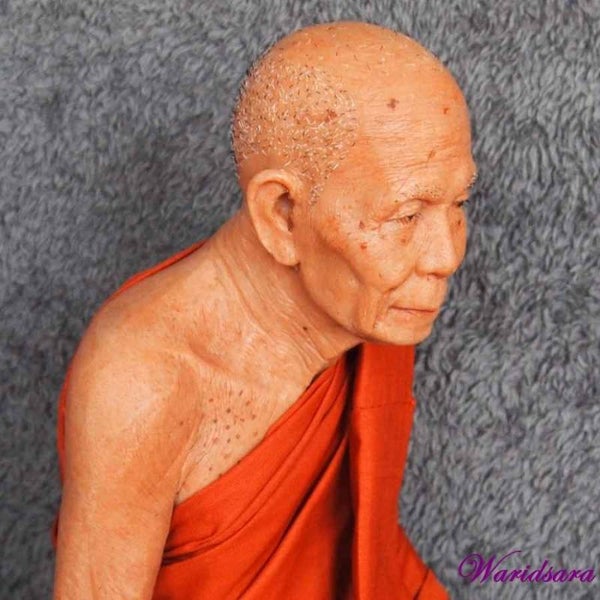 Geheel met de hand vervaardigde Thais Boeddhistische monnik. De monnik is geheel in de originele stijl vervaardigd naar beeltenis van de inmiddels overleden monnik. De kleding is in originele kleurstelling en dracht zoals deze in het klooster van deze monnik werd en nog steeds wordt gedragen.