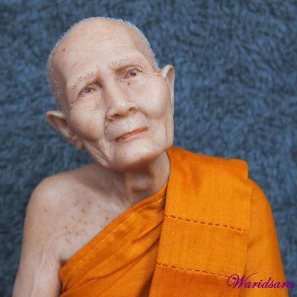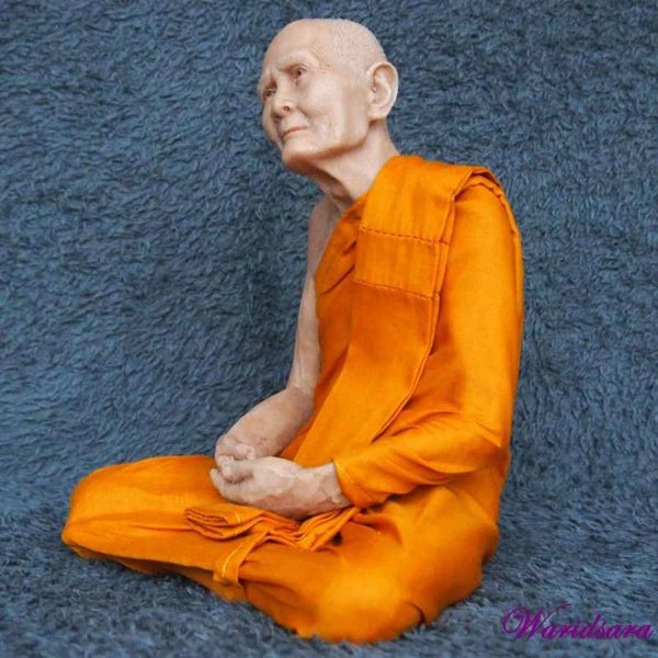 Geheel met de hand vervaardigde Thais Boeddhistische monnik. De monnik is geheel in de originele stijl vervaardigd naar beeltenis van de inmiddels overleden monnik. De kleding is in originele kleurstelling en dracht zoals deze in het klooster van deze monnik werd en nog steeds wordt gedragen.