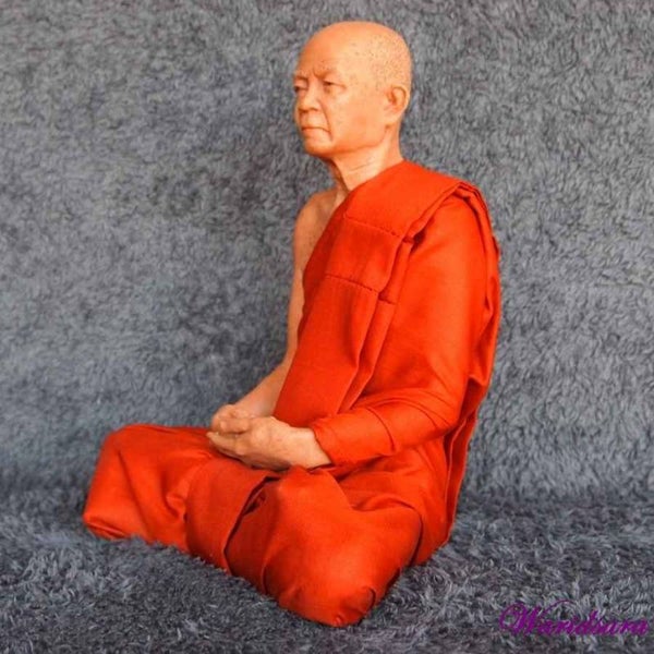 Geheel met de hand vervaardigde Thais Boeddhistische monnik. De monnik is geheel in de originele stijl vervaardigd naar beeltenis van de inmiddels overleden monnik. De kleding is in originele kleurstelling en dracht zoals deze in het klooster van deze monnik werd en nog steeds wordt gedragen.