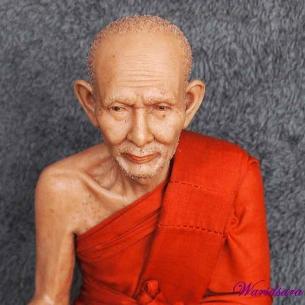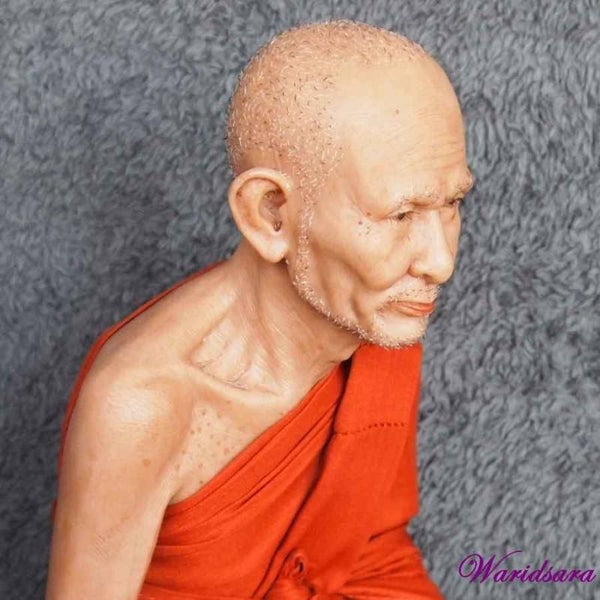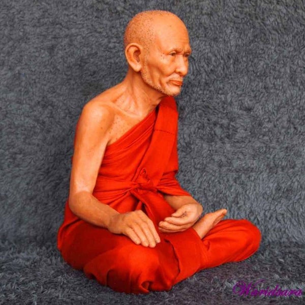 Geheel met de hand vervaardigde Thais Boeddhistische monnik. De monnik is geheel in de originele stijl vervaardigd naar beeltenis van de inmiddels overleden monnik. De kleding is in originele kleurstelling en dracht zoals deze in het klooster van deze monnik werd en nog steeds wordt gedragen.