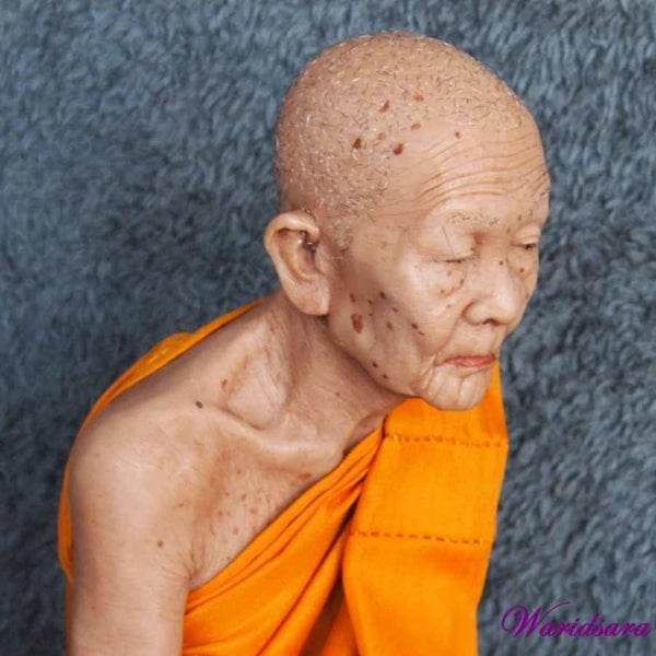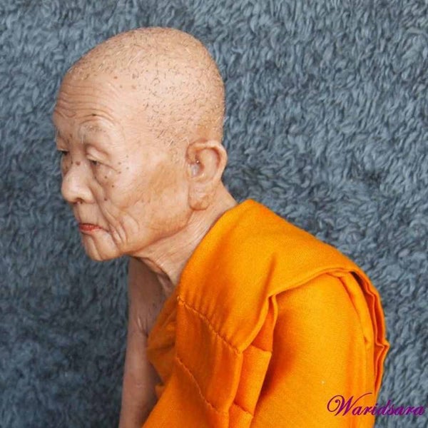 Geheel met de hand vervaardigde Thais Boeddhistische monnik. De monnik is geheel in de originele stijl vervaardigd naar beeltenis van de inmiddels overleden monnik. De kleding is in originele kleurstelling en dracht zoals deze in het klooster van deze monnik werd en nog steeds wordt gedragen.