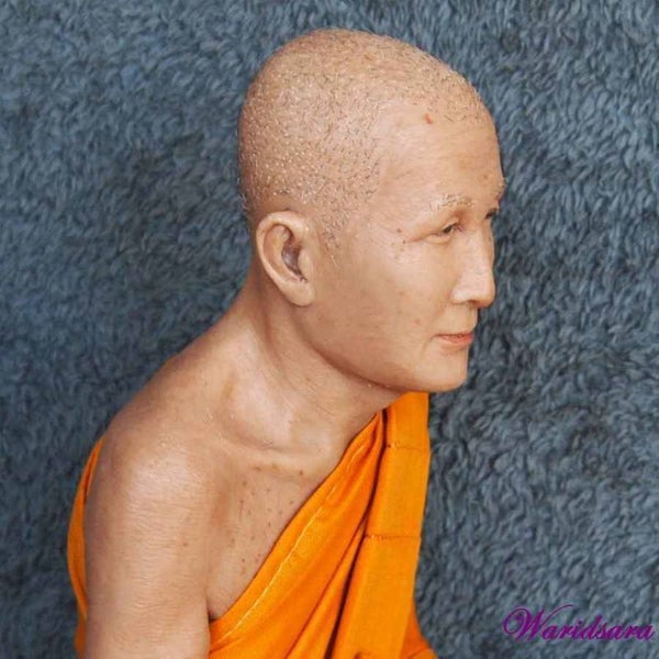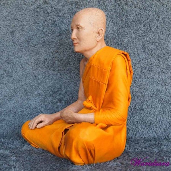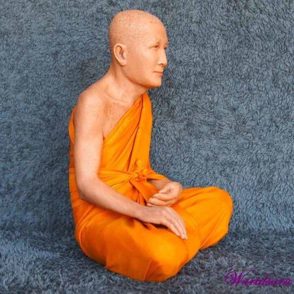 Geheel met de hand vervaardigde Thais Boeddhistische monnik. De monnik is geheel in de originele stijl vervaardigd naar beeltenis van de inmiddels overleden monnik. De kleding is in originele kleurstelling en dracht zoals deze in het klooster van deze monnik werd en nog steeds wordt gedragen.