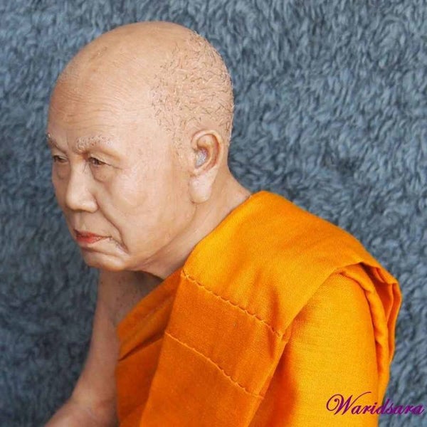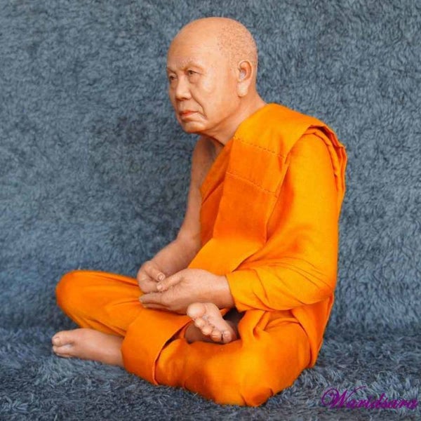 Geheel met de hand vervaardigde Thais Boeddhistische monnik. De monnik is geheel in de originele stijl vervaardigd naar beeltenis van de inmiddels overleden monnik. De kleding is in originele kleurstelling en dracht zoals deze in het klooster van deze monnik werd en nog steeds wordt gedragen.