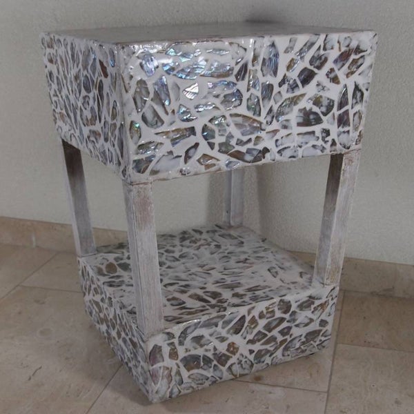 Wij hebben een aantal exclusieve bijzettafels. Deze zijn met de handgemaakt naar ons eigen idee van schelpen in een glasfiber verbinding.