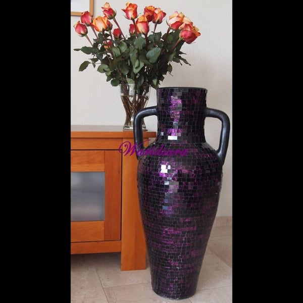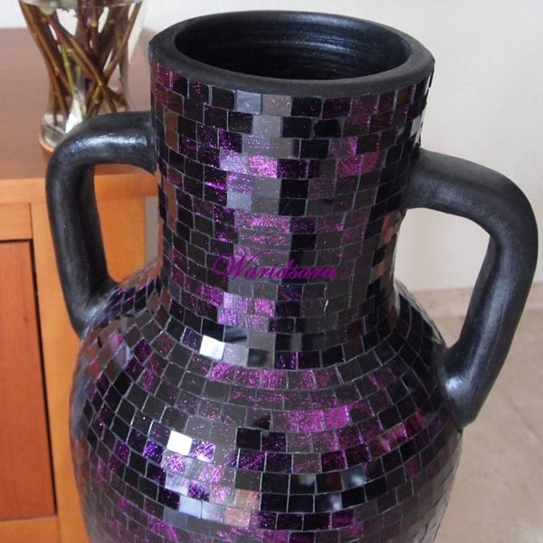 Deze mozaïekvazen zijn gemaakt van terracotta, ingelegd met stukjes glas in mozaïek. Als deze vazen "gevangen" worden door het zonlicht dan zie je het extra effect van deze mozaïek pas goed en worden ze een echte blikvanger in elke kamer.