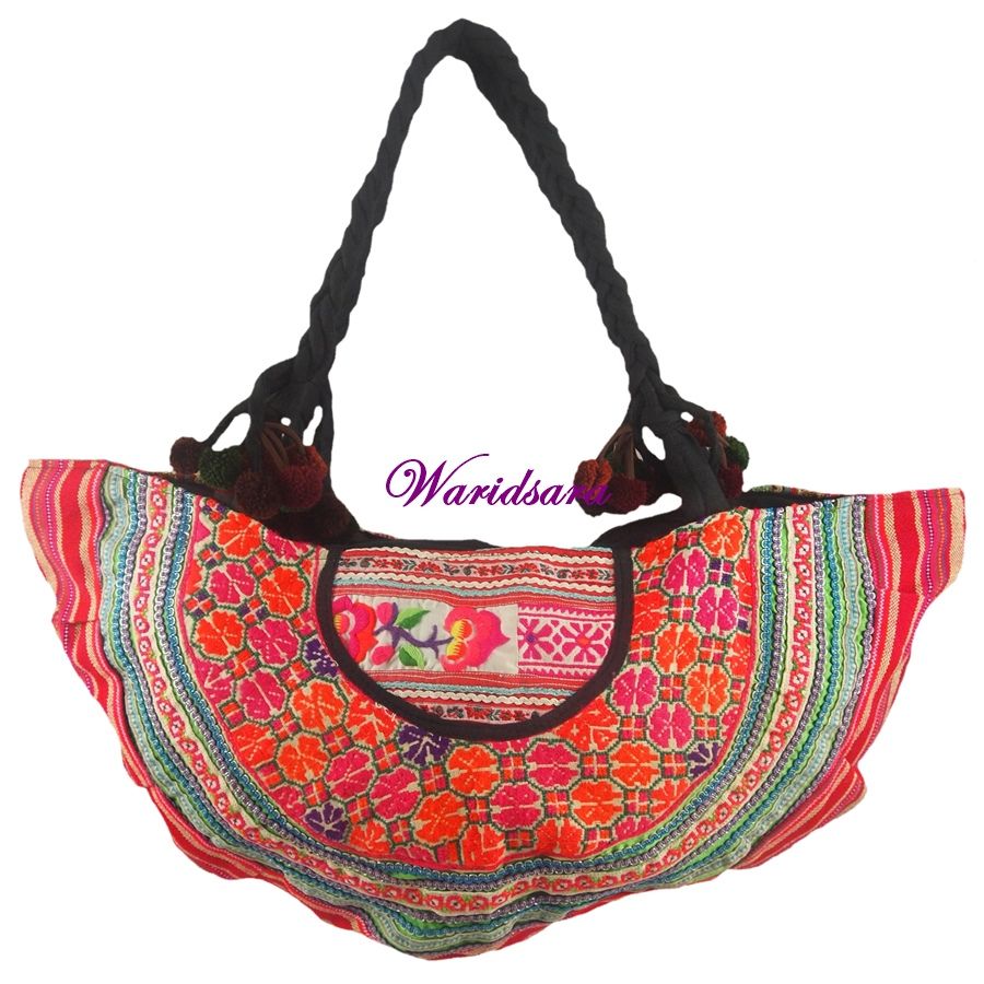 Deze tassen zijn handgemaakt van de prachtige traditionele stoffen van de Hmong Tribe (Hmong betekent “vrij zijn”). Kleurige tassen in de vorm van een halve maan met (korte) gevlochten draagband.