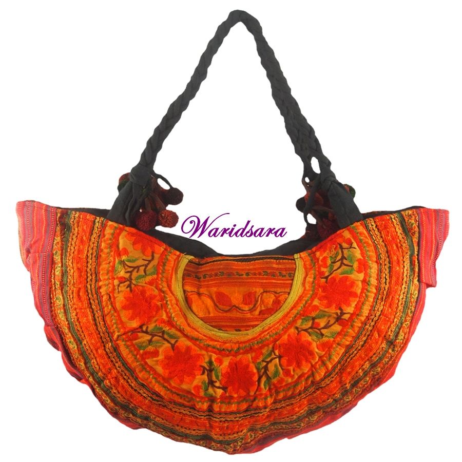 Deze tassen zijn handgemaakt van de prachtige traditionele stoffen van de Hmong Tribe (Hmong betekent “vrij zijn”). Kleurige tassen in de vorm van een halve maan met (korte) gevlochten draagband.