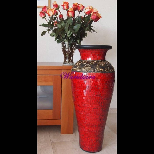 Deze mozaïekvazen zijn gemaakt van terracotta, ingelegd met stukjes glas in mozaïek. Als deze vazen "gevangen" worden door het zonlicht dan zie je het extra effect van deze mozaïek pas goed en worden ze een echte blikvanger in elke kamer.