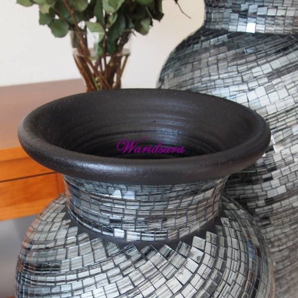 Deze mozaïekvazen zijn gemaakt van terracotta, ingelegd met stukjes glas in mozaïek. Als deze vazen "gevangen" worden door het zonlicht dan zie je het extra effect van deze mozaïek pas goed en worden ze een echte blikvanger in elke kamer.