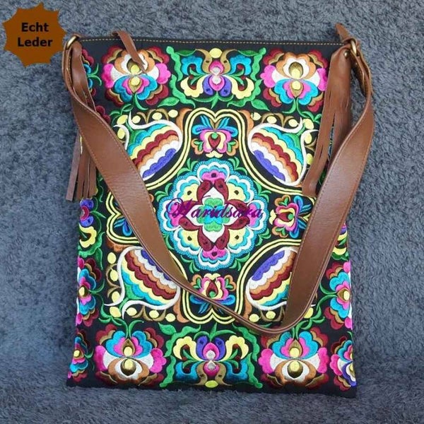 Schoudertassen in combinatie van authentiek Hmong borduurwerk met de beste kwaliteit kalfsleer (Zwart of Bruin)